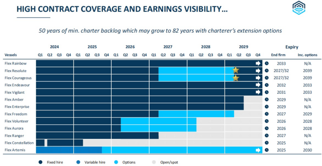 截至目前,Flex LNG运营13艘17.4万立方的超大型液化气船(VLGC)。Flex LNG已经锁定其船队2024年100%营运日收入,2025年为91%。其中1艘船舶通过浮动租金在现货市场营运,11艘船舶签署固定租金的长期期租合同。包括上述合同在内,其期租合同的总期限达到50年,如果包括租船人的选择权,则可达到82年。