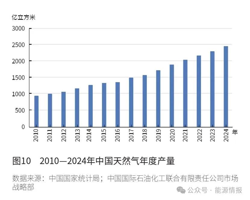 在“增储上产”行动推动下,中国天然气产量将持续增长。2024年中国天然气产量为2463亿立方米(见图10),同比增长156亿立方米,增幅6.8%,过去5年年均复合增长率为6.6%。国内天然气产量增量约占供应侧(产量和进口量)总增量的一半左右。2025年国内油气企业仍将保持勘探开发的投资力度,鄂尔多斯盆地、四川盆地以及海上新项目将显著推动产量继续增长,预计2025年中国天然气产量同比增加140亿立方米,至2600亿立方米左右。