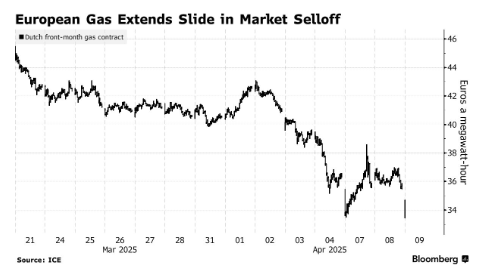 周三基准期货价格一度暴跌 7.7%,较 2 月峰值累计下挫约 40%。美国关税政策正在全球金融市场引发连锁反应:股市油市双双跳水,多位知名投资人对贸易战风险发出警告。截至发稿,欧洲天然气基准荷兰近月期货报每兆瓦时 34.51 欧元,跌幅达 4.75%。