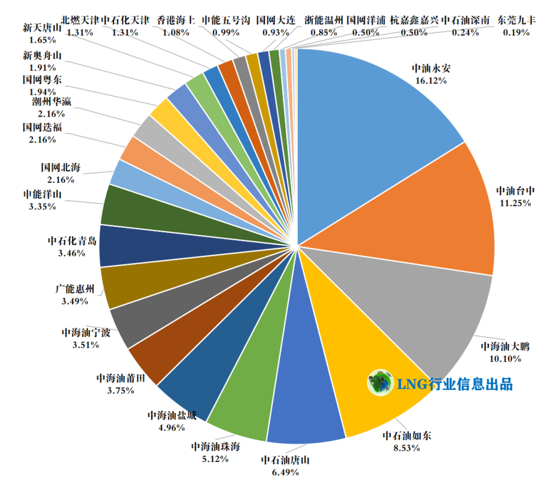 2025年4月,全国所有LNG接收站接卸LNG船总容积1610万立方米(只包含卸船容积),中油永安、中油台中、中海油大鹏分别以16.12%、11.25%、10.10%的占比名列前三。