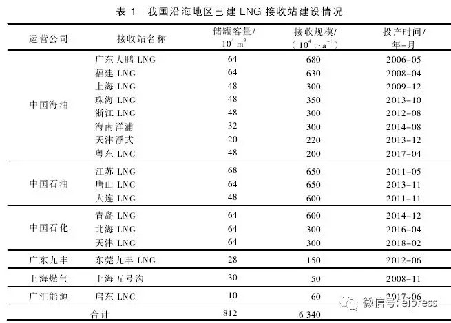 截至2018年2月,我国东南沿海已建成17座LNG接收站,储罐容量812万m3,总接收能力达6340万t/a,分别由中国海油、中国石油、中国石化和部分私营企业投资建设。其中,建成最早的LNG接收站是广东大鹏LNG接收站,最新建成的LNG接收站是中国石化天津LNG接收站。各接收站建设情况详见表1。
