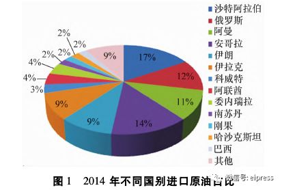 2014年中国进口石油主要来自中东、非洲和俄罗斯,其中沙特阿拉伯占17%,伊朗9%,伊拉克9%,阿曼11%,科威特3%,阿联酋4%,俄罗斯12%,委内瑞拉4%,安哥拉14%,南苏丹2%,刚果2%,哈萨克斯坦2%,巴西2%(见图1)。