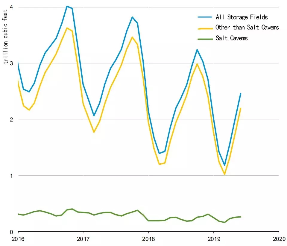 图9 2016~2019年美国地下储气库工作气量(按类型)