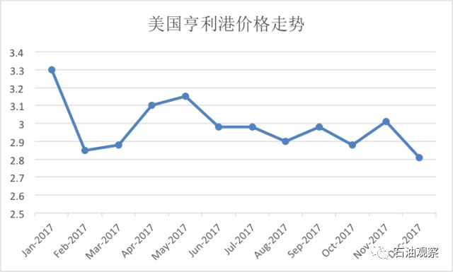 2017年,美国天然气价格走势仍然低迷。由于出口的拉动力量仍然有限,而国内需求量与产量之间仍然有较大的差距,因此,具有代表性的亨利港现货价格在4月之后一路走低,6月跌破3美元/百万英热单位,而到12月,月度均价仅为2.8美元/百万英热单位。