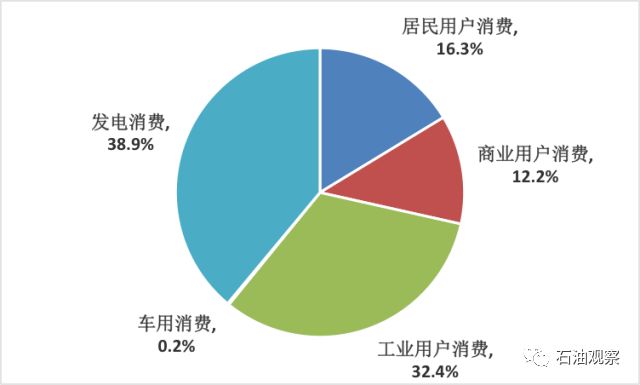 图,2017年美国各用气部门消费比例分布