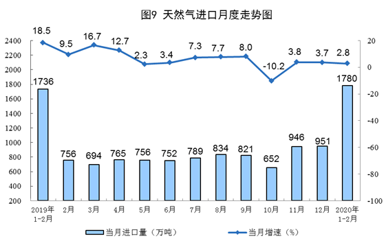 天然气生产较快增长。1—2月份,生产天然气314亿立方米,日均产量5.2亿立方米,同比增长8.0%;进口天然气1780万吨,同比增长2.8%。