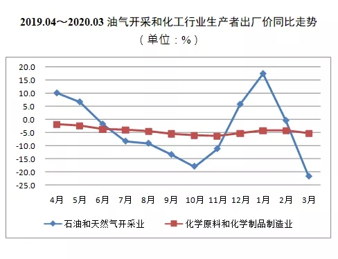 一季度,受新冠疫情影响,石油和主要化学品市场大幅波动,价格跌幅不断扩大。特别是3月份,价格急剧下挫。其中,石油和天然气开采业市场波动尤为剧烈。统计局价格指数显示,当月油气开采业出厂价格同比下跌21.7%,跌幅较上月扩大21.3个百分点;化学原料和化学品制造业跌幅5.3%,扩大1.0个百分点。3月石油和天然气开采业出厂价格环比跌幅达17.0%,化学原料和化学品制造业环比下跌1.4%。1~3月,石油和天然气开采业价格总水平下跌2.2%,化学原料和化学品制造业跌幅4.6%。