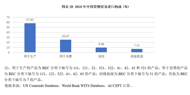 我们以HS分类下每一个4位编号为单位分析进口生产用产品的规模,计算每一类产品进口金额占2018年中国货物贸易进口总额的比例,如图表21所示。集成电路产品(HS8542)是中国进口占比最大的生产用产品,2018年进口占比为27.9%,是排在第二的铁矿石(HS2601)进口占比的14倍。进口占比超过1%的产品还包括金及相关制品(HS7108)、石油气相关制品(HS2711)与大豆(HS1201)等。在集成电路产品中,处理器与控制器(HS854231)占比43.1%,存储器(HS854232)占比38.1%,合计占比超过80%。因此,中国的电子产业对国际产业链的依赖程度较高,相关风险值得警惕。