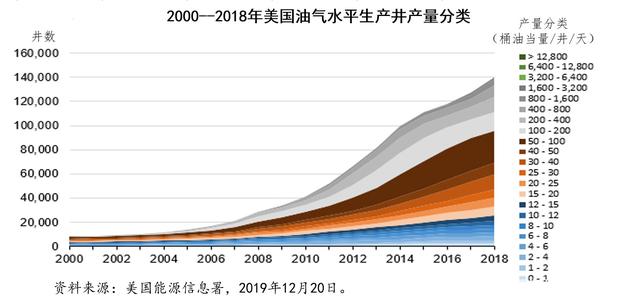 2008年至2018年间,每天产量少于15桶油当量的井数,占美国全部油气生产井的80%,而美国石油和天然气产量的绝大部分来源于100—3200桶油当量/天的生产井。