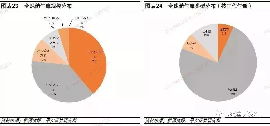 统计表明,全球地下储气库平均工作气量为5.5亿立方米,工作气量规模小于5亿立方米的地下储气库为549座,占比77%;4种类型地下储气库中,气藏型地下储气库工作气量最大,约占总工作气量的75%,含水层型地下储气库占12%,盐穴型地下储气库占7%,油藏型地下储气库6%。