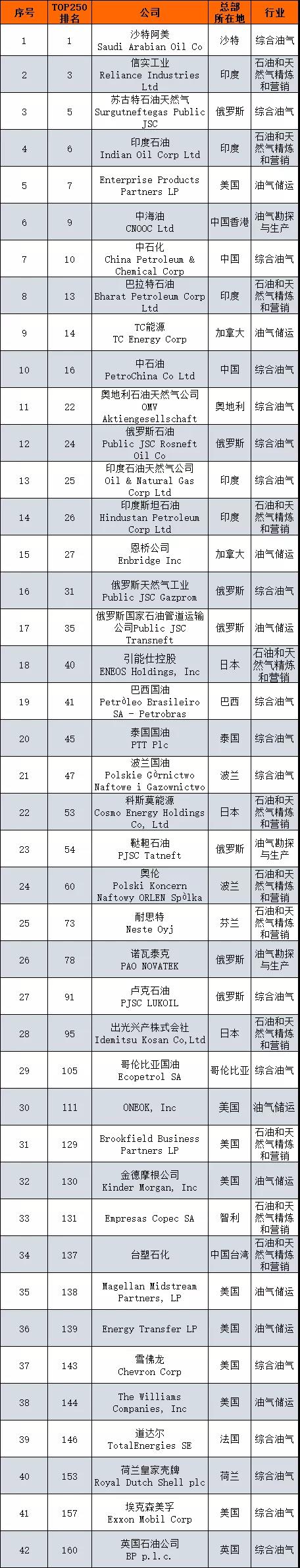 此次进入榜单的多是国家石油公司,除了中国“三桶油”,比如沙特阿美、俄油、俄气、奥地利石油、印度石油、巴西国油、泰国国油、波兰国油、哥伦比亚国油等。