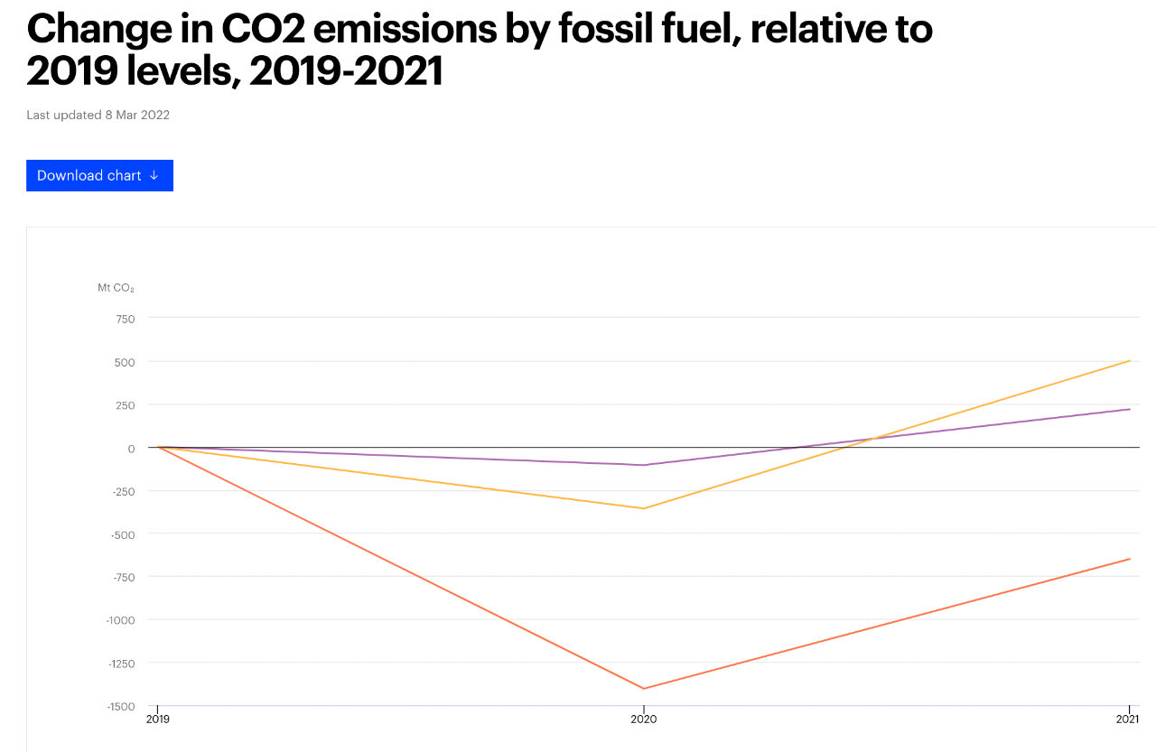 2021年煤炭导致的碳排放占全球二氧化碳排放总量40%以上,达到153亿吨的历史最高水平。天然气的二氧化碳排放量反弹至75亿吨,远高于2019年的水平。石油导致的碳排放约为107亿吨,仍然大大低于疫情大流行前的水平,因为全球航空运输至今尚未恢复。