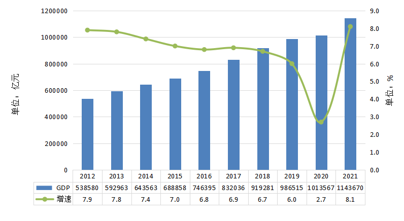 据国家统计局初步核算,2021年国内生产总值1143670亿元,比上年增长8.1%,高于6%以上的预期目标,两年平均增长5.1%。全年最终消费支出拉动国内生产总值增长5.3个百分点,资本形成总额拉动国内生产总值增长1.1个百分点,货物和服务净出口拉动国内生产总值增长1.7个百分点。全年人均国内生产总值80976元,比上年增长8.0%。