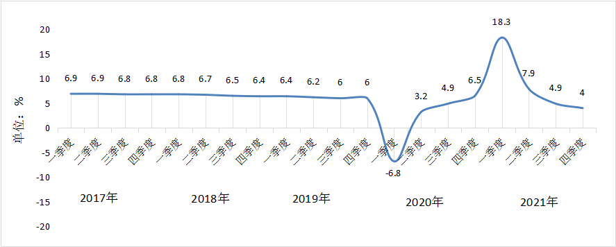 分季度看,2021年一季度国内生产总值同比增长18.3%,二季度增长7.9%,三季度增长4.9%,四季度增长4.0%。按两年平均算,分别增长4.9%、5.5%、4.9%、5.2%,经济运行总体平稳。总体上看,2021年季度增速与上年受疫情影响的基数有直接关系,但受河南、陕西水灾以及南京疫情等因素影响,三季度开始增速明显放缓。