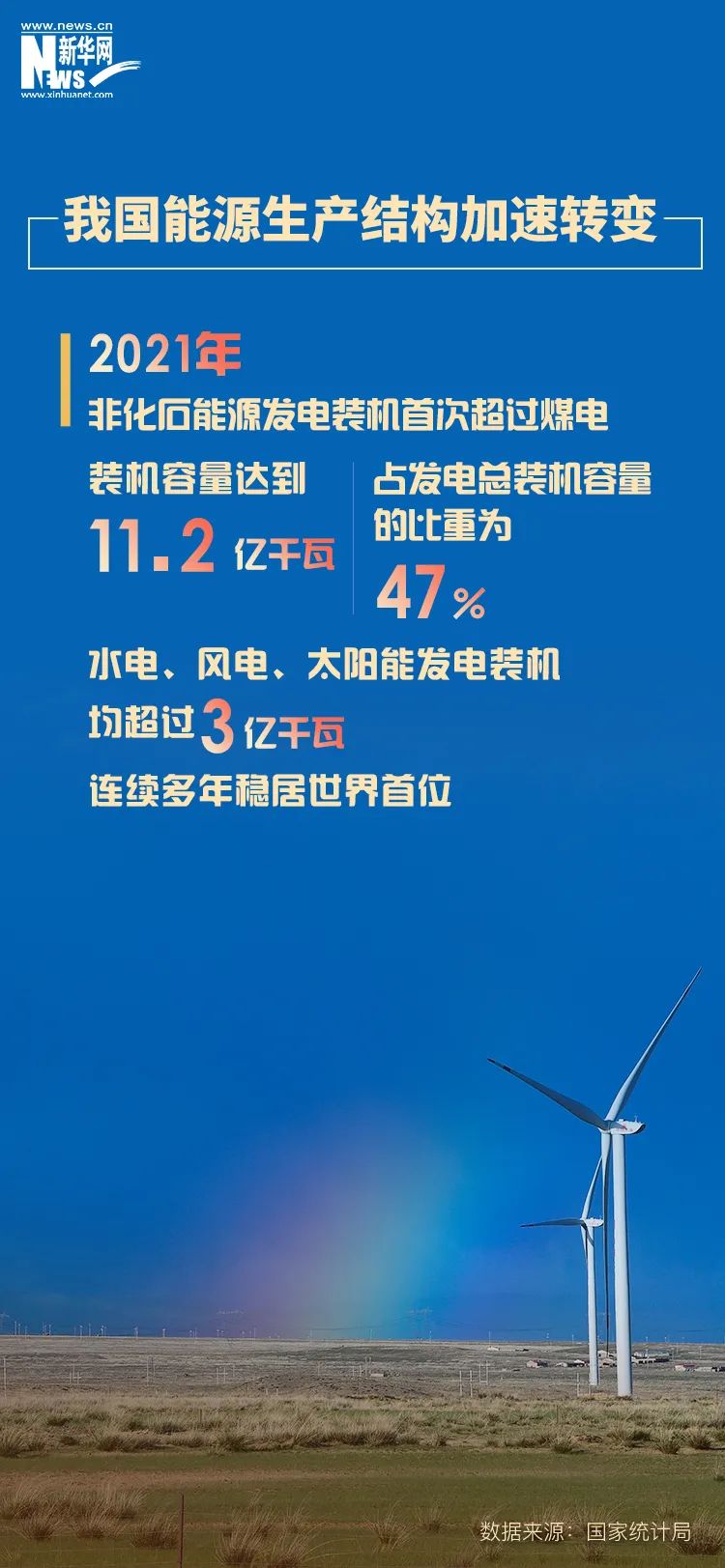 报告显示,我国能源生产结构加速转变,清洁能源占比持续提升。2021年非化石能源发电装机首次超过煤电,装机容量达到11.2亿千瓦,占发电总装机容量的比重为47%。水电、风电、太阳能发电装机均超过3亿千瓦,连续多年稳居世界首位。
