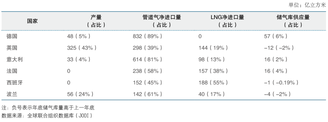 根据消费量和来自俄罗斯的天然气进口量,德国、英国、意大利、法国、西班牙、波兰这6个国家2021年天然气供应结构如表1所示。除英国天然气对外依存度为57%外,其他5个国家均在76%以上,都处于较高水平。具体来看,2021年德国进口天然气全部为管道气,高度依赖俄罗斯天然气;英国、意大利、法国、西班牙、波兰则同时具备进口LNG和管道气的能力,管道气净进口量占总供应量的比例分别为39%、81%、58%、45%、61%,除西班牙进口LNG数量高于管道气数量外,其他国家仍以进口管道气为主。西班牙对俄罗斯天然气的依赖度最低,波兰也相对较低。