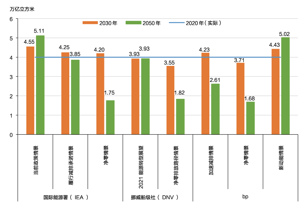 2.1 全球天然气利用趋势演变 从主要国家天然气利用趋势看,在产业发展初期,天然气消费增长通常来自城市燃气、工业等领域;此后,随着城镇化进程和工业化进程结束,发电成为推动天然气利用规模进一步提升的重要动力。目前,发电用气在全球天然气消费结构中的占比约为34%。 从部分典型机构对中长期天然气发展趋势的展望来看,它们对全球天然气需求总量趋势判断基本一致,主要有以下几方面。一是在“净零”碳排放情景下,2030年前全球天然气需求相对稳健,较2020年小幅增长或基本持平,2030-2050年需求下降且幅度较大,国际能源署(IEA)、挪威船级社(DNV)、bp公司三家机构预测降幅分别在-58%、-49%、-36%;二是“净零”情景下,天然气中长期需求较其他情景相对更低。根据国际能源署预测,“净零”情景下,2050年全球天然气需求较当前政策情景低66%(见图2)。总体看,天然气作为最清洁低碳的化石能源,全球范围一定时期内仍具较强需求韧性,但中长期在能源系统转型中的不确定性较大。