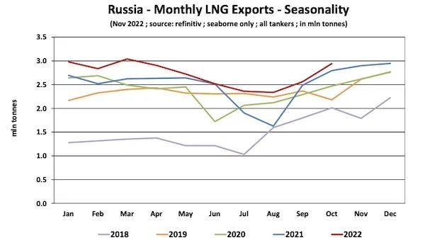 购买俄罗斯LNG的主要客户仍然是欧盟。2022年1-10月,俄罗斯对欧盟LNG出口量同比增长41.8%,从2021年同期的960万吨增至1350万吨。2022年前10个月,俄罗斯LNG出口量的49.8%仍以欧盟为目的地。另一方面,对英国的出口量同比下降82.5%,从去年同期的170万吨降至30万吨。仅次于欧洲的第二大目的地是日本,占俄罗斯LNG出口量的近21%。今年对日本的出口量同比下降0.5%至560万吨,对韩国的出口量同比下降20.9%至160万吨,占其总出口量的6.0%。2022年前10个月,俄罗斯对中国大陆的LNG出口量同比增长21.2%至440万吨,占其总出口量的16.1%。