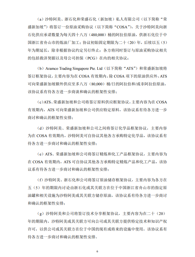 此外,荣盛石化还与战略合作方沙特阿美及其关联方签订战略合作协议项下原油采购等一揽子协议,双方就原油采购、原料供应、化学品销售、精炼化工产品销售、原油储存及技术分享等方面进行合作。