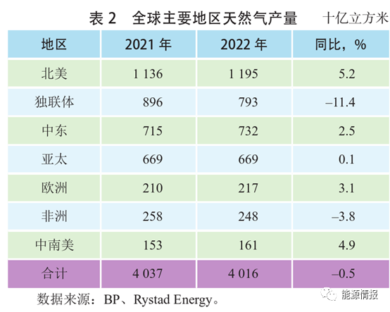北美地区以美国为主,受极端天气影响建筑用能激增,但煤炭大量出口欧洲,天然气消费同比增长3.7%。亚太地区天然气消费同比下降0.6%,其中,中国经济受到疫情多点频发、社会需求不足等多重超预期因素冲击,叠加高气价,天然气消费下降;日本和韩国受高气价影响,采取节能和使用替代能源等方式减少天然气使用;东南亚地区、印度等遭遇高温天气和煤炭短缺,加之自身天然气产量下滑,不得不转向国际市场寻求高价资源,但天然气消费量仍然下降。2022年全球天然气产量达4.016万亿立方米,同比下降0.5%(见表2),主要是受上游勘探开发投资长期不足、以及俄罗斯受制裁影响产量下滑、东南亚地区资源接替能力下降等影响;但LNG出口需求增加拉动了北美和中东地区生产活动、欧洲采取包括提高本区域产量在内的方式替代俄罗斯进口管道气、中国加大勘探开发力度等对全球天然气产量下降起到了很大程度的对冲弥补作用。