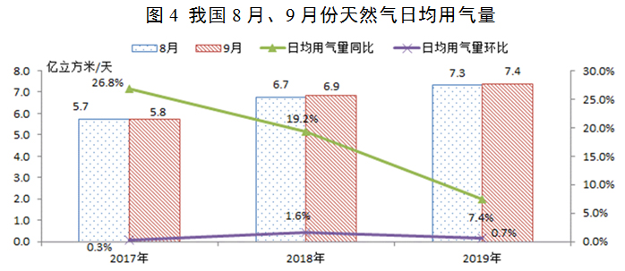 温度逐渐下降,夏季用气高峰期接近尾声,居民煤改气带动公服煤改气新用户增加,城燃用气较去年增加9亿方,全月城市燃气消费量同比增速为15.7%;